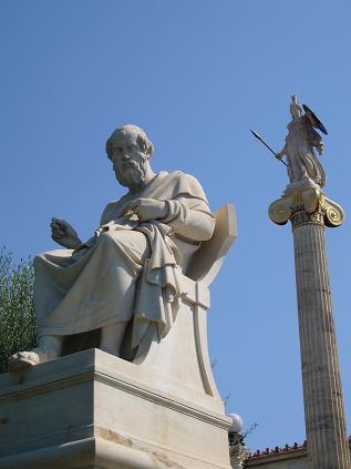 (写真は、アテネ、アカデミーのソクラテス像。後方は、アポロン神像。)
