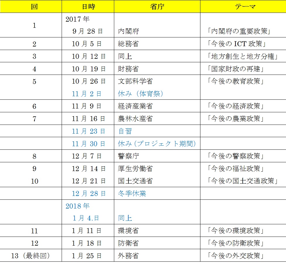 国の各省庁の主要施策について専門的知識を得るとともに、ディベートおよび政策形成・判断能力を培う。